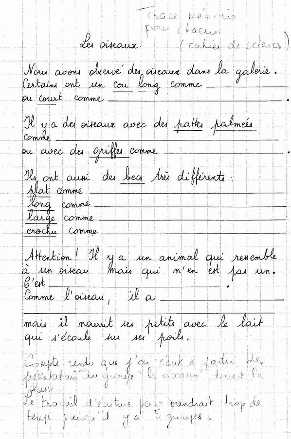 Chacun a mis son texte personnel dans son cahier d’expériences. Les enfants du groupe ont ensuite fait une présentation orale de ce qu’ils avaient appris. L’enseignante a rédigé pour la classe une trace mémoire à coller dans le cahier de sciences (trace_memoir). |